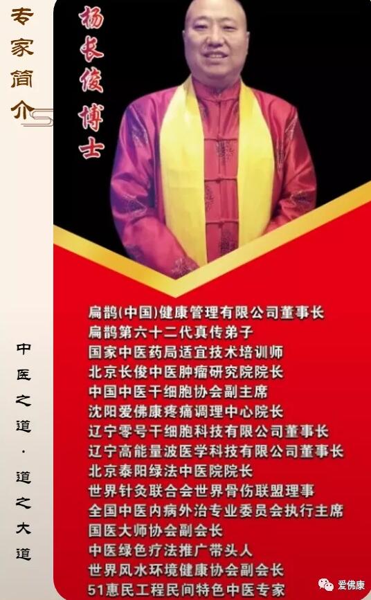 杨长俊老师拜师无数,学到手的绝活太多了,从头到脚治疗各种疑难杂症。头痛,头晕,盲人,眼疾,耳聋,哑巴,白血病,地中海贫血,糖尿病,高血压,股骨头坏死(立刻能轻松走路),面瘫、偏瘫、滑囊炎(立刻就好),各种颈椎病腰脱还有冠心病,心脏病,胸疼,胸闷气短,心肌缺血,心肌梗塞要搭支架的!甭管专家名医叫你搭几个支架!经过我的秘传绝技!很快就好(所用秘法秘训给此期学员)!2020年疫情爆发,杨院长研究易经五行五色五声五味可以健康改变命运财运,更好地帮助更多的有缘之人。