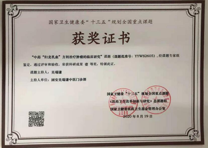 5、山东聊城市高女士、49岁、于2009年3月因患乳腺癌多发转移疼痛难忍而前来我院就诊治疗、据丈夫说、近一月来发展疼痛难忍、坐卧不安、每天需打杜冷丁8支、通过服用中药加歸龙乳血治疗疼痛缓解、解除了痛苦、延长了生存期。