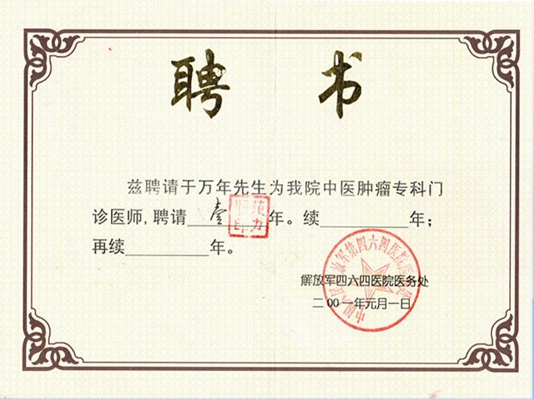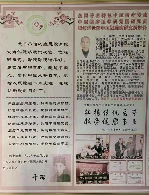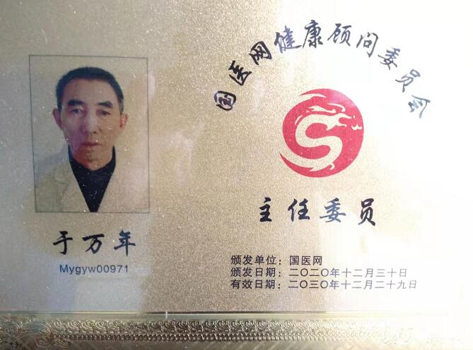 于万年,河北廊坊人,中医世家,中医全科,中医肿瘤主治医师,全国著名特色中医治疗专家,中国临床医学继续教育研究院研究员,曾任天津市工人医院中医肿瘤科主任、南开区长江医院中医瘤科主任、河西肿瘤医院中医主治医师、解放军第464医院肿瘤专科门诊医师、中国人民解放军第222医院中医肿瘤科主任、广阳区于万年中医诊所负责人,现任廊坊济世园中医疑难病研究所所长。