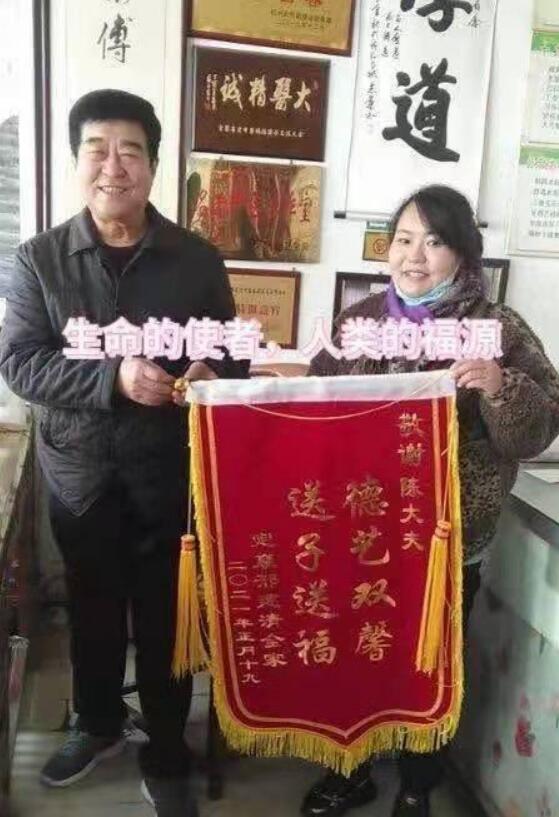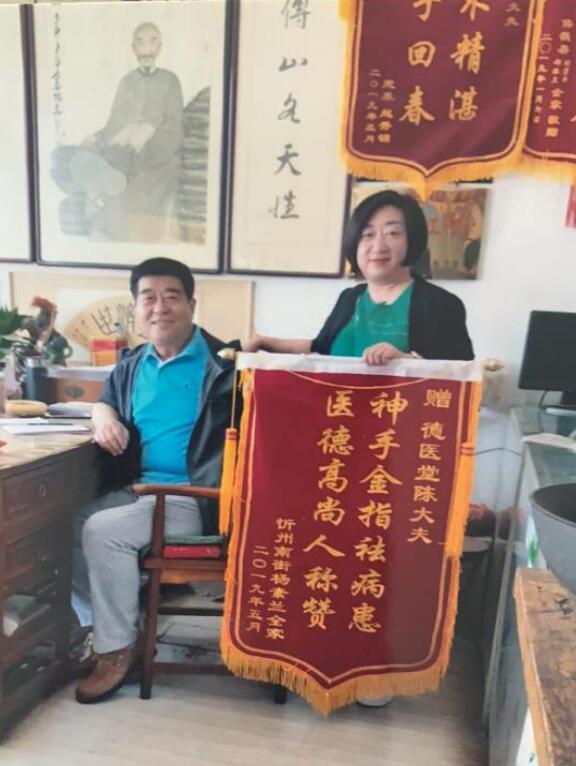 11、多囊卵巢综合症:18 岁女大学生张某某,忻州繁峙人,经人介绍来德医堂就治,患者自述其卵巢囊肿半 年余,一直经西医输液消炎治疗,虽有好转,但停药后很快又复发,难以治愈, 偶尔还伴有小腹疼痛,生活工作质量严重下降。于是为其诊脉后,诊断为肝郁气滞、宫寒下冷,本来子宫就够寒凉,再输液后会更加历害,遂其开汤药五剂,五天后患者来到诊所,自述吃完药后肚子就没有再疼,后去医院做 B 超显示囊肿已消失,于是再为其开药五剂,以巩固疗效,随访至今,无复法状况,痊愈后张某及家人非常激动,为了表示感激,专程来了一趟诊所,把从家乡定制的锦旗交给恩人陈大夫。