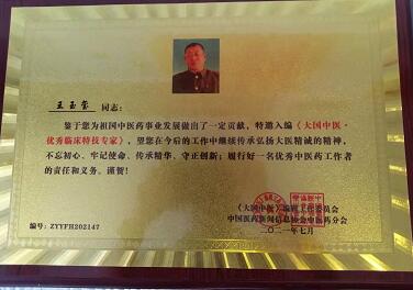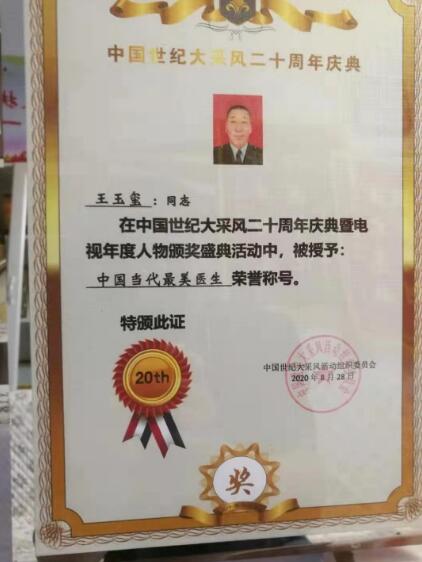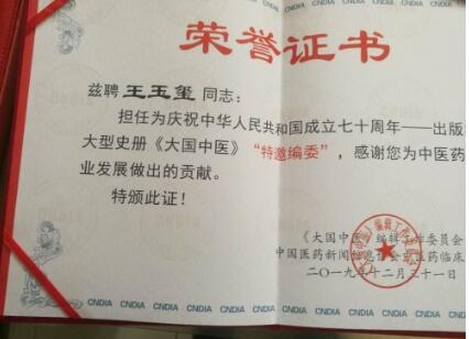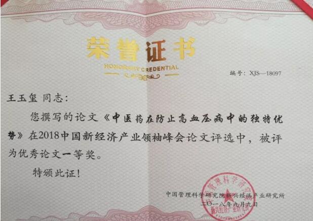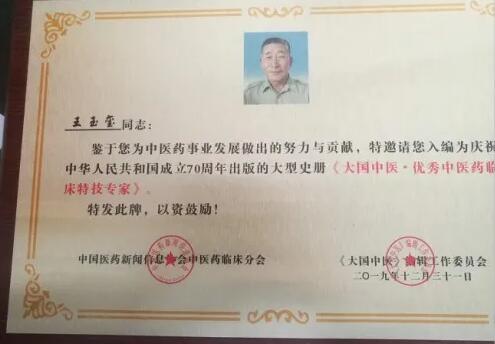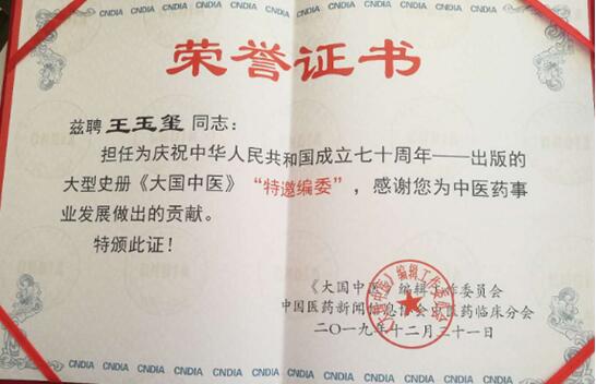 王玉玺1993年7月,在全国中医特色诊疗专方专药论文大赛中《独活寄生汤治风湿性关节炎》被评为优秀学术论文二等奖,并载入中医古籍出版社出版的《当代中医必效奇方秘术》一书;
