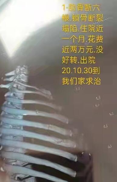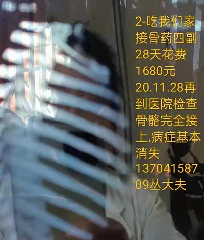 在去治疗痛风的路上,不慎被石头绊倒,恰巧右边前肋骨又倒在一块石头上。第二天起坐的时候感觉肋骨那里不得劲,没当回事。第三天早晨直腰及喘气咳嗽肋骨那里感到疼痛,到医院x光检查:三根肋骨骨折,并有少量淤血。医院大夫说:肋骨骨折只能住院打消炎针养护……。其家属曾骨折用我们家的接骨药好的。他便放弃了医院住院打消炎针,到我们家寻医。在我们家吃了半个月的接骨药后,喘气直腰行走翻身肋骨骨折处基本不疼了,脚脖子及拇指后的痛风病点红肿也消失了,只是拇指后关节里用力走路弯曲的时候还疼点,到医院检查;尿酸降到380,肌酐降到104,血糖8以上,血压85-115。继续再吃半个月的接骨药。自己感觉一切很好,痛风处及肋骨骨折处都没有一点痛感了,胰岛素打6个单位的了。也没有再到医院花钱检查,至今很好。