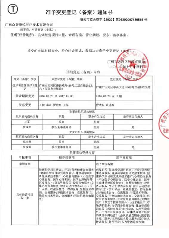 2020年,与罗成兴合资经营广东众智康医疗科技有限公司。