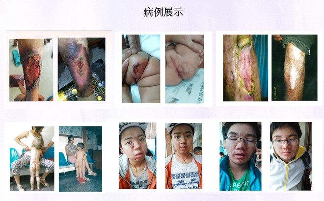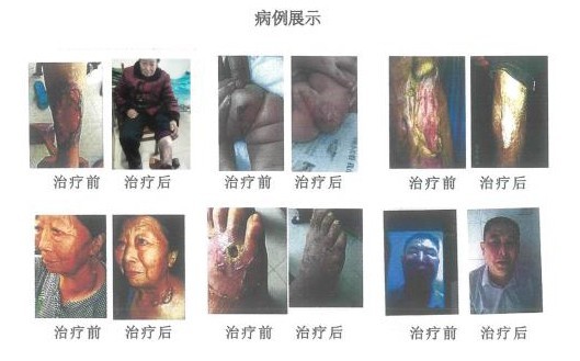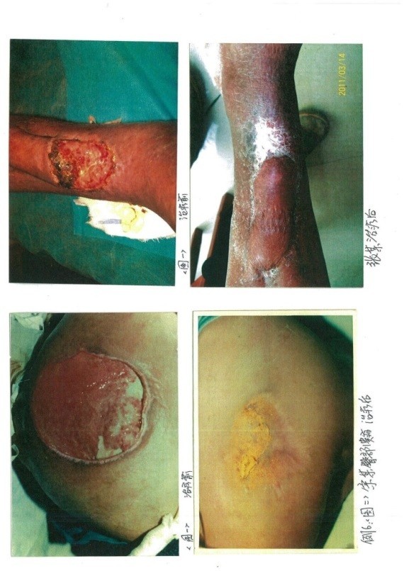 例6 :宋XX,女,65岁,三台县柳池人,因脑益溢血伴左侧肢体瘫痪半年。臀部及右大腿大面积溃疡,在某医院住院4月,其溃疡面未愈,来我处治疗,经用松柏油膏、绿丹水等2月而愈。