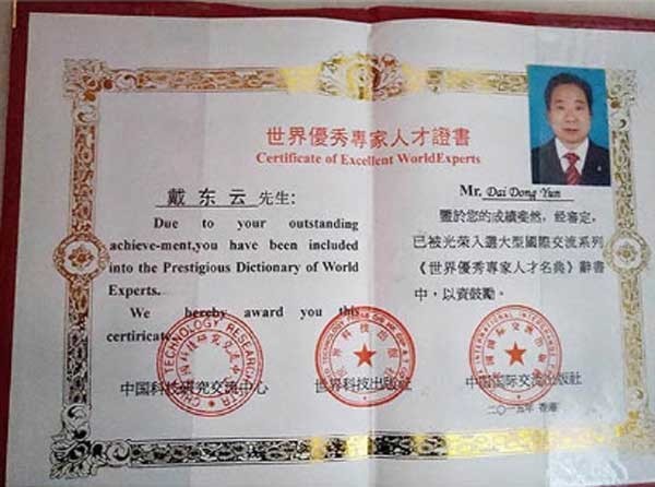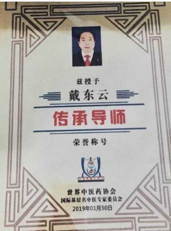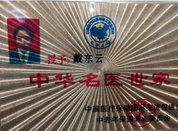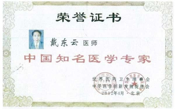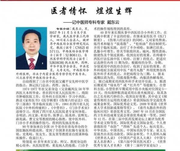 戴东云,男,1957年11月5日生于医学世家,戴氏医学第三代传人,四川省三台县人,被世界中西医结合医学研究院认定、教授(证号:CN62l4l5711)、中西医结合医学博士(证号:SJB0611)、自然医学科学院院士(证号:SJK0838)执业医师、药师、中华中医学会会员。中共党员,大专文化,中西医结合外科医师,毕业于内蒙古医药专修学院中医专业、川北医学院中西医结合专业。