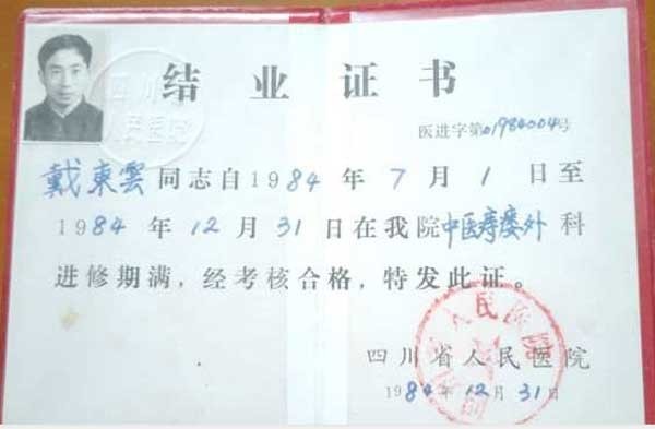 自幼得到了三台名中医祖父戴平安先师中医学的指点,熟记医门总决、药性、汤头。1974-1977年在父亲身边(父亲戴凤仪58年华西医大本科毕业,曾在四川省人民医院外三、绵阳市肿瘤医院工作,任外科主任医师)学习中西医,熟读《家传医书》《医学辑要》《伤寒六经证法》《医学三部曲》等并临床实践三年。1984在四川省人民医院《中外科痔痿科》、《中骨科》、《门诊手术室》进修学习,得到了四川省人民医院老专家何体乾、余明滔、冯文新、杜琼书、陈梦云、陈兆祥、雷辉先、薜兆满、曹文安等教授的精心指教,使中医外科、门诊小手术的操作技巧,得到的发扬及传承。90年参加来自全国18个省市在青岛举办的全国肛肠医师提高班,受到了全国肛肠专家张东铭、史兆岐、张友生、张友奎等教授亲自授课和临床操作,收益巨大。特别是30多年来在父亲、师父、教授身边的精心培养,从医院管理,重危病人的抢救,门诊手术的操作规程得到的真传。