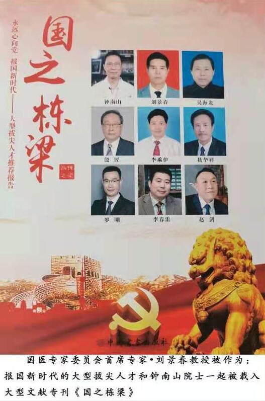 刘景春医生的事迹和荣誉被作为封面人物载入《国之栋梁》、《采风中国》,《时代风骨与璀璨成果》,《共和国思想者》,《共筑辉煌》,《时代榜样》,《激荡百年》,《中医药创业成果创新人物资源库》等多部大型文献辞书。