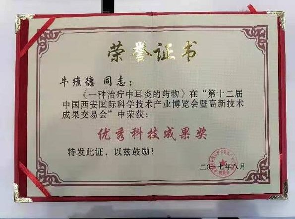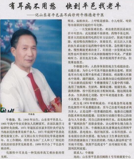 3、牛维德分析人的身体别的地方生疮能治愈,也能自愈,为什么中耳炎不能治愈和自愈呢?原因是耳内生疮长期不愈形成了溃疡面,没皮肤,整天在脓水中泡着,越烂越深,怎么能想办法结疤变干长出新的皮肤呢。他查阅了大量中药书籍,按中医理论组方配制而成一种治疗中耳炎的中药组合物,能达到攻毒杀虫、生肌敛疮之功能,使中耳炎迅速痊愈,愈后不易复发,不留后遗症。本方通过上百次改进,使用轻粉等药物按中医理论组方配制后,研细过150目筛而成。