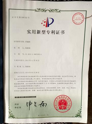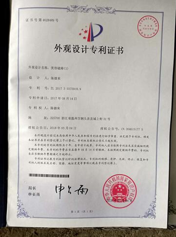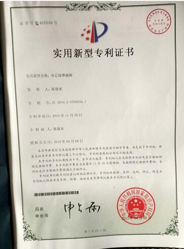 15、2015年又获得了最新的改进型的最新的专利证书,健身按摩磁棒201420715099.9,改进型在原有功能的基础上又加上了对心脑疾病有很好防治作用的特定磁场及特定穴位,对防治心脑疾病有更好的疗效。