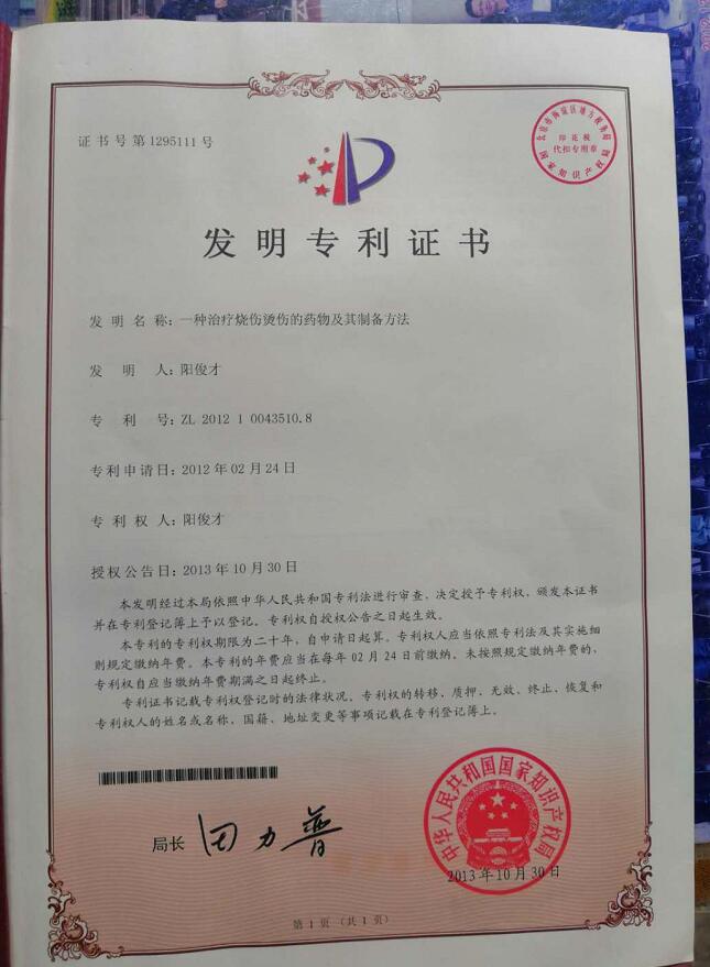 为近百余年祖传秘方,现经科学配制而成,具有近五十年的临床使用验证,填补了历史治疗烧烫伤无药敷的空白,效果特佳,无 任何副 作用。本品为紫褐色或紫红色的液体,具有纯正米酒香味。主要成份:鸡血木、半边莲、当归、油葱、午时花、老鼠瓜、鸭脚草等,该药液擦、淋喷上患伤处即可。对一般轻徽烫伤,即刻上药迅速止痛消炎。20-30小时便可完全愈合,10天左右伤口疤痕逐步自行修复。2-3度烫伤糜烂无须高额手术植皮费,即刻敷药不再创伤,就会自然长出新皮肤,10-15天左右可完全好。本品于2013年09月04日审核确定为国家专利产品,专利号2012100435108,发文号201308260434020。本烫伤专利技术计划转让,欢迎有识之士前来洽谈合作!