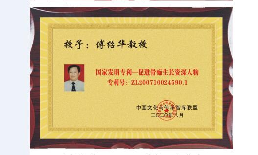 1、1983年父母亲把祖上传下来的这个古老的接骨药方传交给傅绍华老师,经过傅绍华老师近三十年在民间为骨折患者治疗的过程中不断探索,认证这个古老药方的真正作用,同时进行了改进(因为这个药方太古老了),得到了现在向人们介绍的这样的接骨作用。2007年傅绍华老师向国家知识产权局递交了专利申请书,2009年国家知识产权局颁发给傅绍华老师国家发明专利证书,专利名称:一种促进骨痂生长的骨伤接骨药物组合物。专利号:ZL200710024590.1。