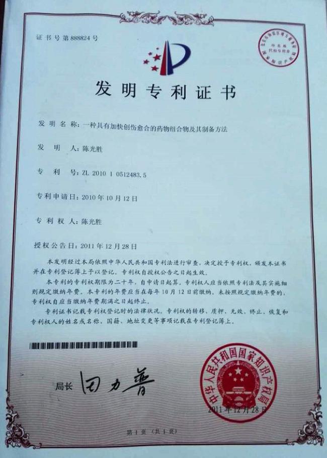 为了继承和发扬我们祖国的中医事业,挖掘祖国中医中药的宝库,我在长辈秘方的基础上,结合现代中医理论,西医高科技仪器影像学诊断结论,进行潜心研究,把处方进行归类,膏药形状进行改进,逐步完善了祖传秘方的配伍和制备方法的不足,现已研制出①陈氏神奇风湿去寒膏药,②陈氏神奇骨炎膏药,③陈氏神奇化瘤膏药,④陈氏神奇创伤膏药。其中“陈氏神奇骨炎膏药”已获得国家发明专利。