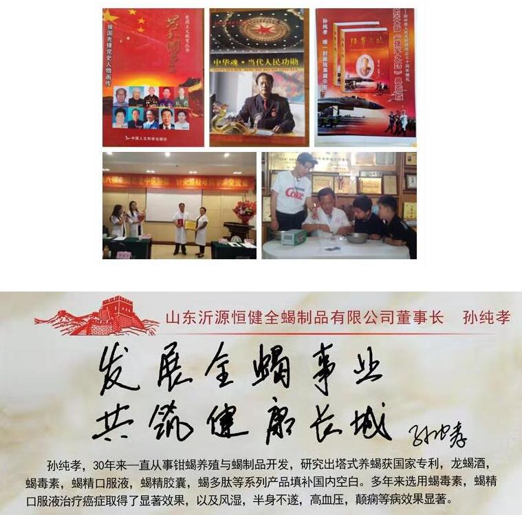 1、在山东省淄博市沂源县,一位资深养蝎人三十余年不改初衷,全身心投入到家乡沂蒙特产全蝎的养殖与产品开发中,通过不断探索和创新,成功研制出塔式仿生快速养蝎专利技术,并研发出中华蝎王系列产品,为人类健康事业留下了浓妆重彩的一笔。他就是山东沂源恒健全蝎制品有限公司董事长、淄博沂蒙技术开发研究所所长、淄博市沂源县科委高级工程师孙纯孝。30多年来,孙纯孝自强不息,持之以恒,敢于创新探索、勇于创新的精神,赢得了事业的成功和发展,也赢得了社会各界的敬佩和信任,获得了数不清的荣誉和称号。他曾先后被评为中国科技之星,劳动模范和拔尖人才,被誉为“中华蝎王”,被评为中国医疗卫生著名专家,中国国际权威专家,中国管理科学院研究员,被聘为香港国际科学院院士,中国医师协会“治未病”讲师,中国医促会中老年健康指导委员会委员,2007年度中国十大领军人物,共和国60年华诞着名爱国功臣勋章,被入编《中国贡献》,《科技引领未来》,《当代影响力人物金典》,《中国世纪专家》,《世界名人大典》,《中华魂》,《迈向世界中国科技》等文献,人民日报、科技日报、农民日报、大众日报、淄博日报、中央电视台、山东电视台、山东广播电视台、台湾东森电视台、CCTV7每日农经等多家媒体进行报道。