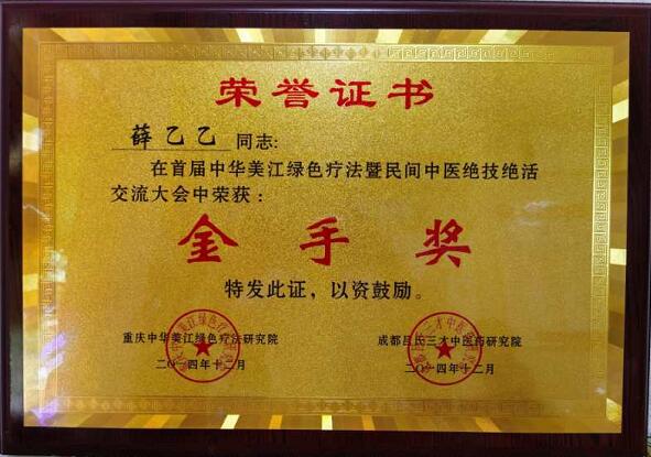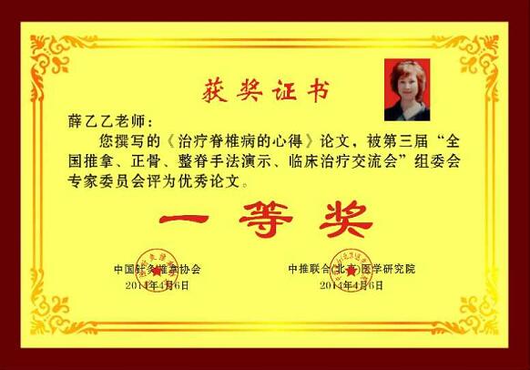 5、薛乙乙在祖传正骨复位手法基础上,不断总结和研究临床,顿悟出一套简单、轻柔、独特、速效、实用的全新正骨手法,使脊椎引起的疾病能迅速得到缓解,甚至痊愈,已为国内外众多知名人士及省市领导解除病痛,送去了福音,俗话说让自已健康是美德,让众人健康是公德。