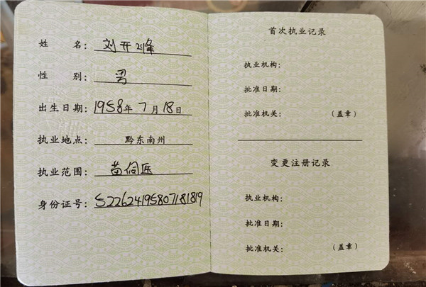 刘开峰,性别:男,年龄62岁,侗族联系电话:18285560718 工作单位:黔东南三穗县瓦寨镇民间骨伤科诊所