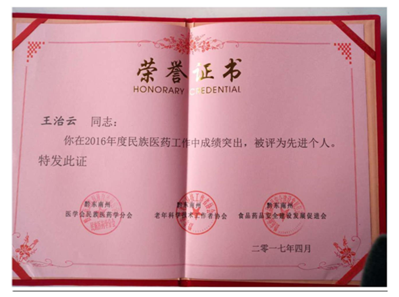 案例二:介绍这位王女士是龙泉镇医院的医生,于 1998 年冬季不幸患上了腰椎结核,椎旁形成约 18X19cm 的脓肿包块。患者疼痛难忍,不能翻身,大小便不能自理。经多家大医院医治无效。当时患者体质具有三高,不能手术开刀局部清除。最后住都匀四一四医院治疗无效而回家“等死”。经人介绍,该患者接受我苗药治疗,服药后 40分钟,患者感觉翻身轻松,疼痛减轻,1 个小时后自己可以下床解便(床边马桶)。经用40天的“苗药”治疗获得终身康复,至今已有20 周年,随访无复发。