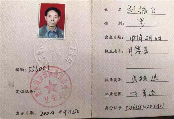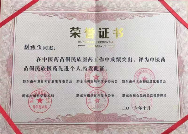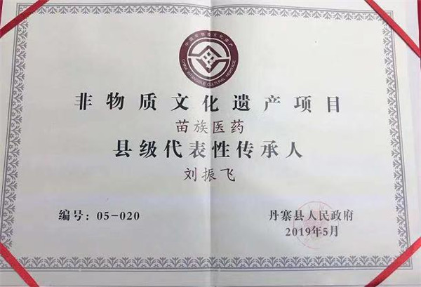 刘振飞一贵州省黔东南州丹寨县民族中药研究所负责人著名家传苗族中药医师,中国民族医药学会会员;贵州公安戒毒所中草药顾问。2001年与四川重庆市中山医院协议建立中草药肿瘤科,获民族执业医师证; 2004年被聘为西安市第六人民医院分院中医科主任,西安中西医结合医院肿瘤科主任;2005年被聘为贵州省贵阳市苗医医院肿瘤科长期顾问;2009年任“中国民族医药学会”会员并获得“全国首批医学行业优秀人才模范”的称号;2009年发表论文《苗医“如意汤”治疗肿瘤个案》获全国第三届侗医药学术研讨会论文证书。