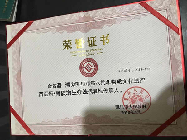 苗族女医师潘清是在医药世家成长的、女医师潘清是贵州省凯里市人,主理的苗族草医堂,使用世代祖传苗药秘方和贵州深山草药为患者治疗。在2017年取得《民族医生资格证书》,2018年列入凯里市非物质文化遗产苗医药.骨质增生疗法代表性传承人。治疗痛风、风湿关节、膏结石、肾炎、肾积水、肝硬化腹水、妇科病、不孕症、跌打扭伤、骨质增生、坐骨神经、颈椎、腰椎间盘突出、心脏病、哮喘、肺气肿、肺结核、肺炎、肾结石积水、胆囊炎、胰腺炎、阑尾炎、肠炎、胃病、肠梗阻、痔疮、皮肤病、带状疱疹等领域有独到见解。