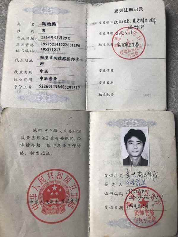 陶政路.男.55岁.侗族.中医执业医师.本人于1987年天柱卫校毕业.本年9月份进入天柱高朗镇卫生院工作.1990年9月到贵阳中医学院附属医院进修.学习.1993年毕业.1994年到凯里中医院实习.1995年到苗医学校当老师一年.教中医推拿学.1996年大专毕业.回到凯里开设个体医馆1999年取得(国家医师资格证书).2005年取得国家(中医执业医师资格证)至今.现在本诊所以中医内科为主.擅长研究中医内科疑难杂症。