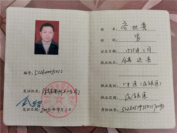 齐世喜,男,汉族,籍贯:贵州省镇远县,学历:专科,1974年12月17日出生于中药世家,父亲从事基层中草药普查并担任办公室主任,受父亲熏陶,自幼喜好中草药材及相关书籍,看见一些植物就好奇地向父亲请教,得到满意的答复后又去寻找不认识的植物继续请教,积累了大量的中草药药理。2009年考入贵阳中医学院学习,不仅学习了理论知识,对中草药实践有了更进一步的指导作用,毕业后一直从事农村基层中草药对相关疾病的治疗,遵循“救死扶伤、治病救人”的宗旨,刻苦钻研,虚心向老中医请教,并得到湖南沅陵张氏祖传四代弟子张治华(贵州日报社记者部周济民曾对此人进行报导)真传,根据传授秘方,对医治腰椎盘突出(膨出)、骨质增生、风湿、肩周炎、颈椎炎等难度较大的疾病及医治烫伤、肛瘘、胃炎.胃溃疡.胃糜烂.虫牙效果最为显著。