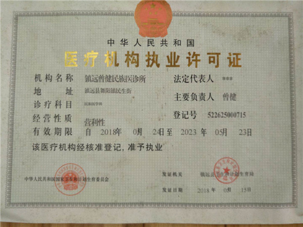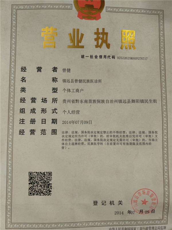 为使杨老大医精神流传后世惠及民生,年近七十曾祥斌将杨老所传医学经验悉传与其子曾健。为彰显民族医疗特色更名为“曾健民族医诊所”,致力于传承大医悬壶济世的精神。曾健医师毕业于贵阳中医学院。随父医,秉承家学,识药辨病;再入贵阳中医学院学习,幸蒙名师指点,医道终得入室,在多种疾病的治疗上颇有心得,以良好的疗效 赢得了病家的广泛认可。笃行“大医精诚”,立志为“苍生大医”,一丝不苟的工作作风和勤专苦学的敬业精神备受患者及同道赞扬。