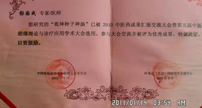 2010年《自创乾坤种子神汤》荣获国际中医药特色疗法奖,