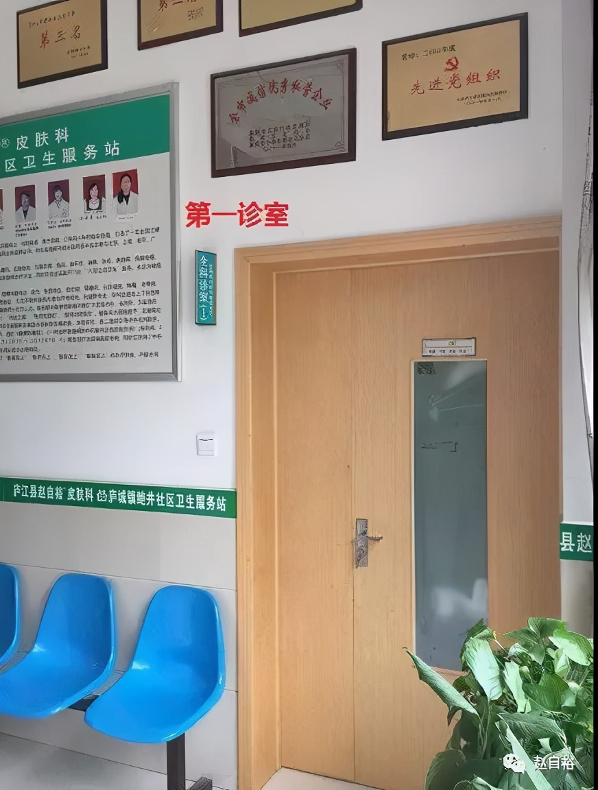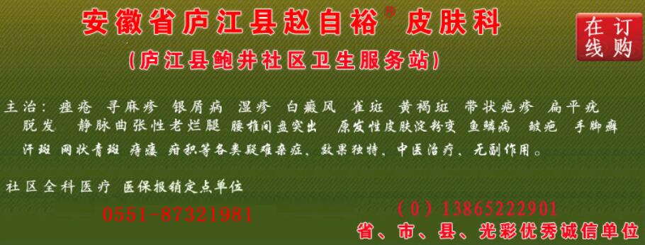 安徽省庐江县张文芝皮肤病专业诊所、庐江县鲍井社区卫生服务站赵自裕皮肤科、中西医诊所。坐落在塔山菜市场对面,农机公司巷门诊,服务居民10000余人,三十余年来,接受患者辐射周边市县,深受政府部门和周边患者认可,医技力量雄厚。本站主治各种顽固性皮肤病及常见病。内外妇儿、五官、口腔、腰椎间盘突出,肩周炎、风湿病、咽炎、前列腺炎、痔痿、疝气、狐臭、包皮过长、泌尿系统疾病、心理咨询等杂症、效果独特,并承担社区医疗、预防、健教、保健、康复、计生等工作,是本县首次批准的几家社区卫生服务站之一,多年来荣获省市县诚信单位位。