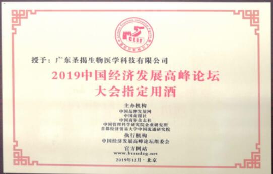 12、2019年12月圣揭堂露酒在2019年中国经济发展高峰论坛暨中国经济影响力人物年会上被中国经济发展高峰论坛组委会授予“大会指定用酒”。