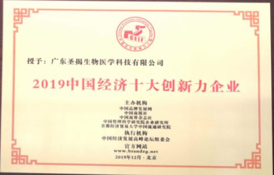 11、2019年12月广东圣揭生物医学科技有限公司在2019年中国经济发展高峰论坛暨中国经济影响力人物年会上获得中国经济发展高峰论坛组委会评定为“2019中国经济十大创新力企业”。