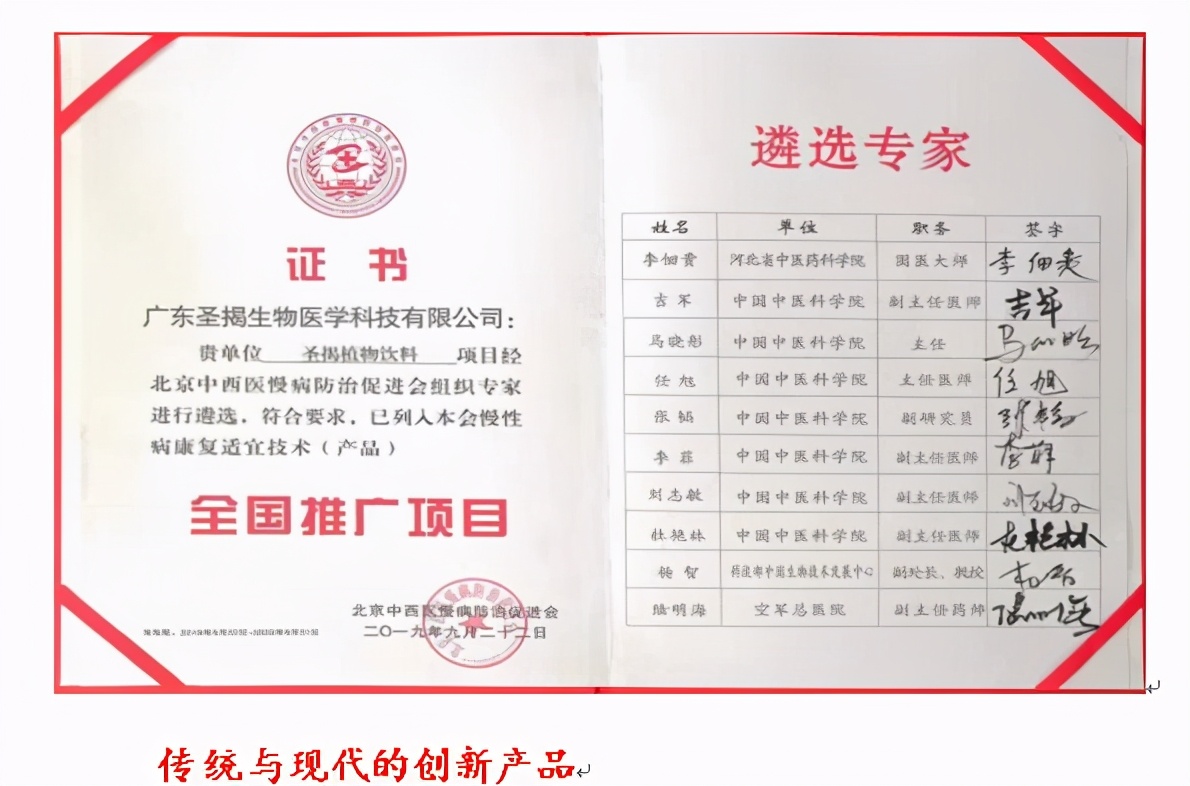 10、2019年9月“圣揭植物饮料”被北京中西医慢病防治促进会列入慢性病康复适宜技术“全国推广项目”。