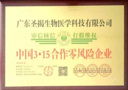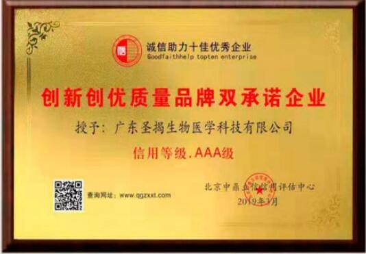 2、2019年5月广东圣揭生物医学科技有限公司获得北京审信核信企业信用评估中心评定为:“AAAAA级全国守合同重信用示范企业”。
