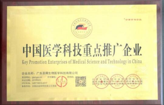 5、2019年8月广东圣揭生物医学科技有限公司获得鉴优品质量认证中心名优产品办公室评定为:中国医学科技重点推广企业。