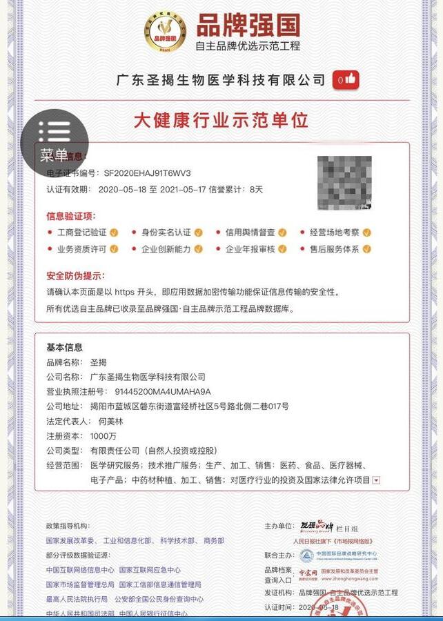 1、2019年3月广东圣揭生物医学科技有限公司获得北京中鼎立信信用评估中心颁发“AAA级全国绿色健康食品证书”。