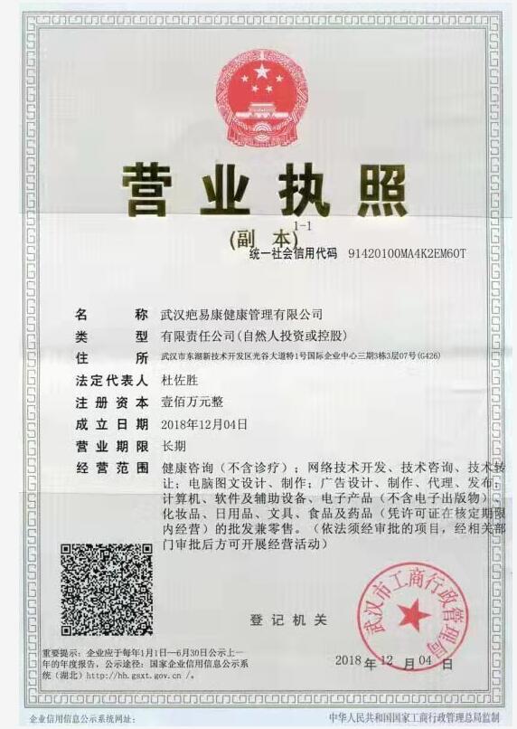 武汉疤易康健康管理有限公司成立于2018年12月04日,注册地位于武汉市东湖新技术开发区光谷大道特1号国际企业中心三期3栋3层07号(G426),法定代表人为杜佐胜。
