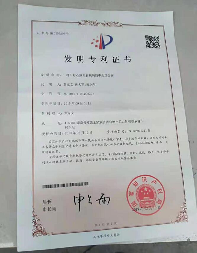 黄家文,翻读古今名著,遍访名医,结合自己的心得,发明了一种治疗心脑血管疾病中药组合物——旺脑康型调剂液,它疗效巩固,治愈率达95%以上,此医药已申请国家专利。