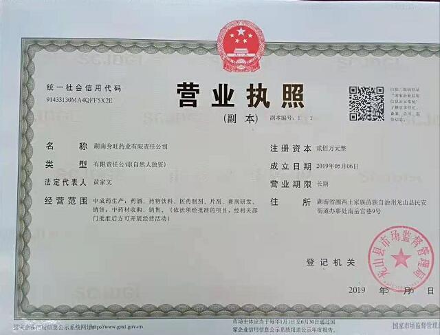 湖南身旺药业有限责任公司成立于2019年05月06日,注册地位于湖南省湘西土家族苗族自治州龙山县民安街道办事处南岳宫巷9号,法定代表人为黄家文。经营范围包括中成药生产;药酒、药物饮料、医药制剂、片剂、膏剂研发、销售;中药材收购、销售。