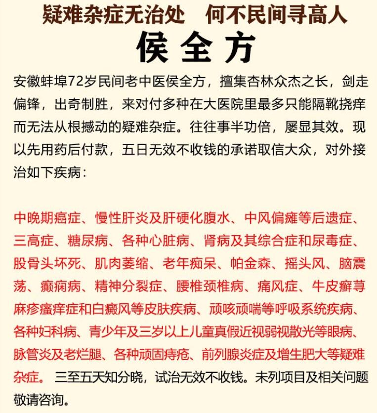 由侯全方老师研发的安全速效治愈高血压和糖尿病的药食同源——泡茶制剂包和泡脚散,以内外同攻、两面夹击的施治办法,可在三至五天内迅速起效,一到两个两疗程左右,彻夜治愈原发性高血压及2型和1糖尿病。泡代茶制剂气味平和比较适口,没有毒副作用。泡脚散为纯中药配方,也非常安全。现决定,从2月20日起,在全国范围内,挑选以上两种疾病中度和重度患者各3000名半价提供上述制剂,直到康复。