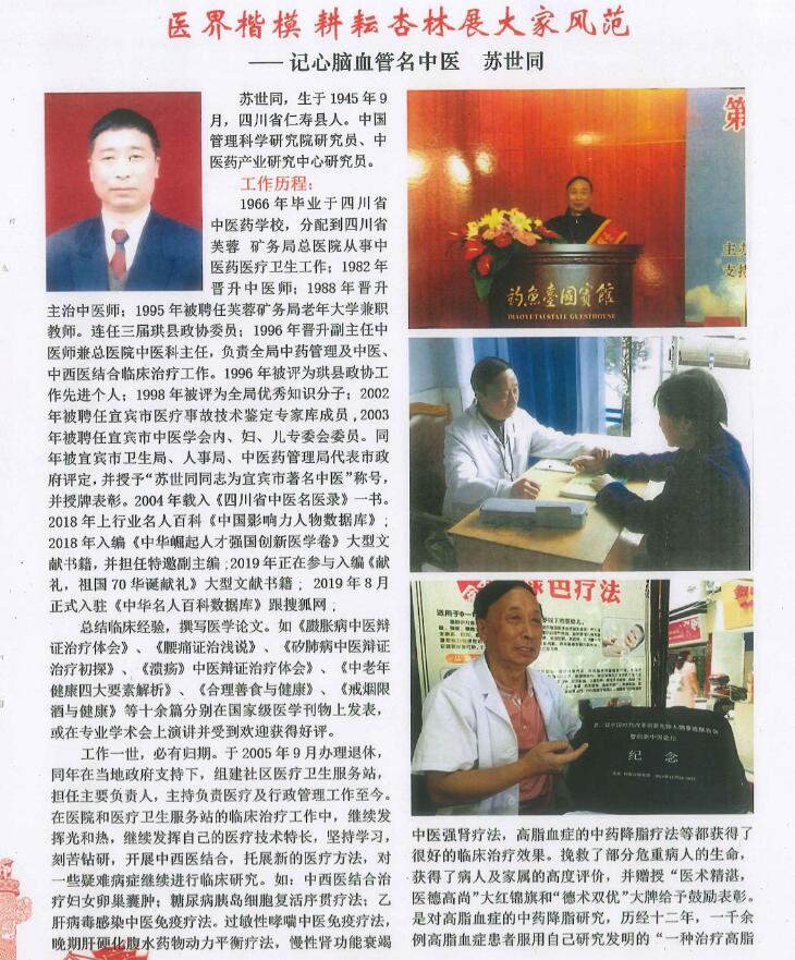 2、今年74岁的宜宾名中医苏世同先生,从上世纪六十年代年开始从事中医工作。50余年来,一直秉承传统中医的理论,用于临床医学实践。从98年开始,历经十二年,苏世同先生通过不断总结研究中医理论,撰写了许多医学论文,如《臌胀病中医辩证治疗体会》、《腰痛证治浅说》、《矽肺病中医辩证治疗初探》、《溃疡》中医辩证治疗体会》、《中老年健康四大要素解析》、《合理善食与健康》、《戒烟限酒与健康》等,其中十余篇分别在国家级医学刊物上发表。
