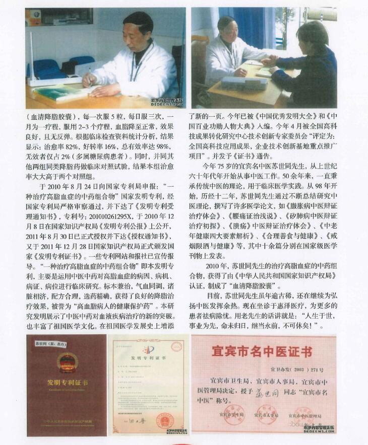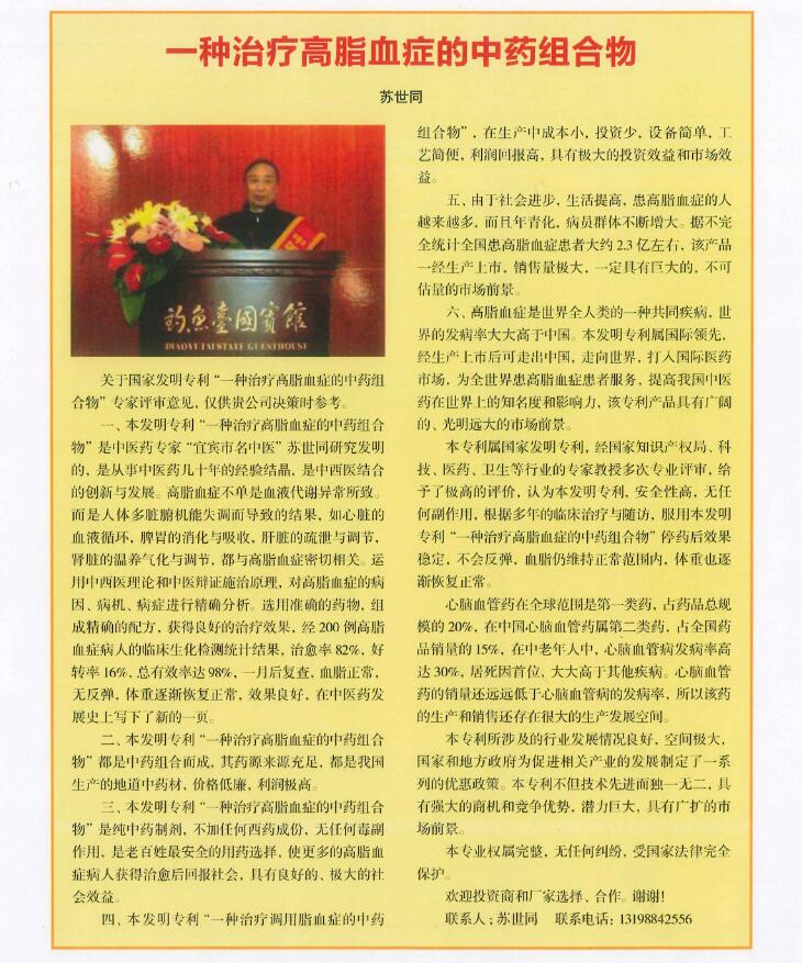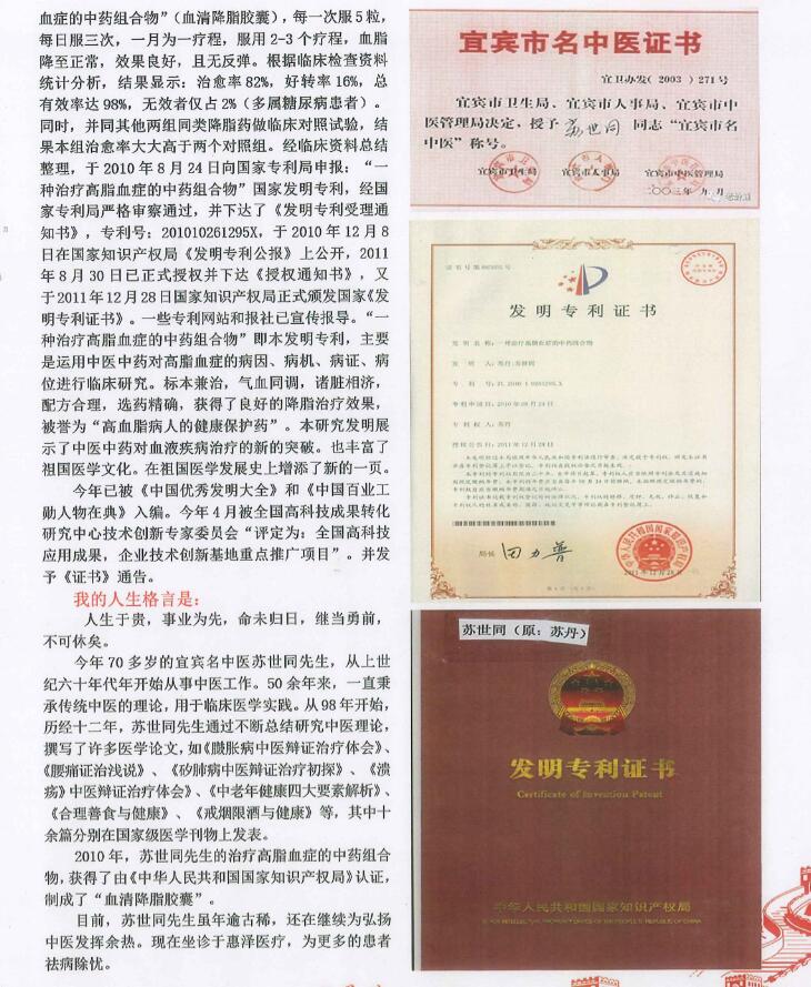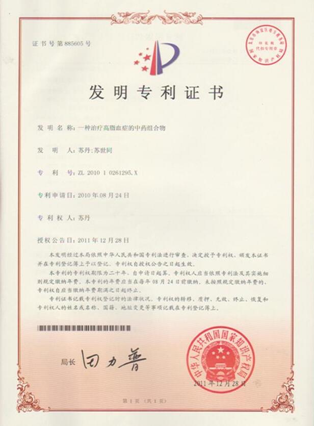 3、2010年,苏世同先生的治疗高脂血症的中药组合物,获得了由《中华人民共和国国家知识产权局》认证,制成了“血清降脂胶囊”。