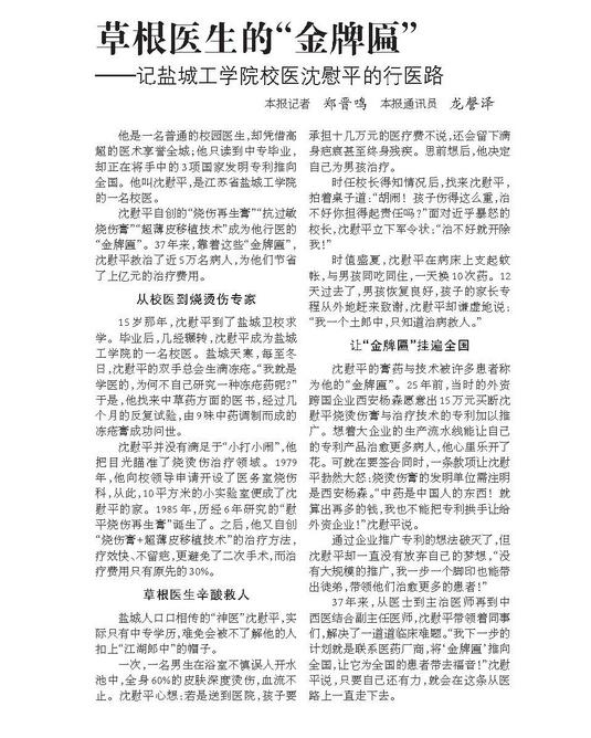 1、沈慰平1975年毕业于江苏省盐城卫校医士班(现江苏医药职业技术学院),从医46年来,一直从事中西医结合治疗烧、烫伤的临床研究工作,他从医士、医师、主治医师、中西医结合副主任医师一步一个脚印,率领他的同事们,治愈6万多名各类烧、烫伤患者,解决了一道道临床难题。