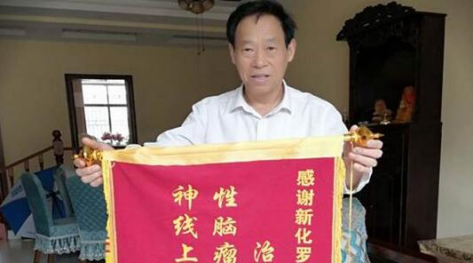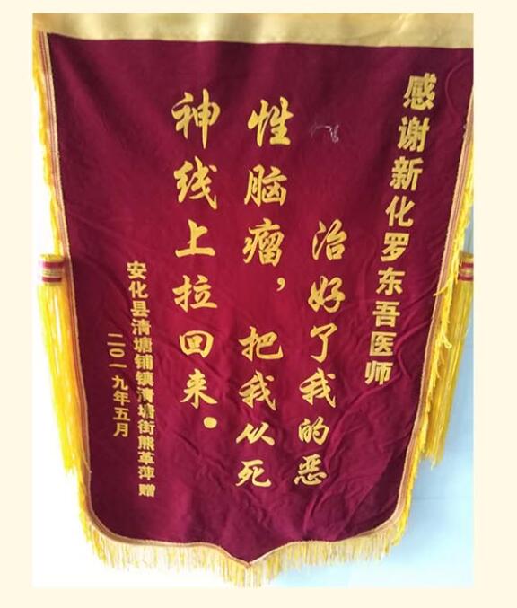 送锦旗的病友名叫熊革萍,湖南省安化县清塘铺镇人,今年52岁。2016年,熊女士在山上劳动时突感身体不适,往前走路身体却象螃蟹一样不由自主地往左或右移动,头脑昏沉,且感觉到四周的所有东西都在旋转。在亲友们的资助下,她去省医院做身体检查,省肿瘤医院诊断为小脑蚓部恶性肿瘤、星形细胞瘤二级,在北京市某医院做开颅手术时,医生切除了脑内其中一个肿瘤,另外一个因风险性太大而仍留在脑内。