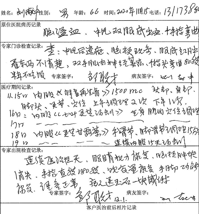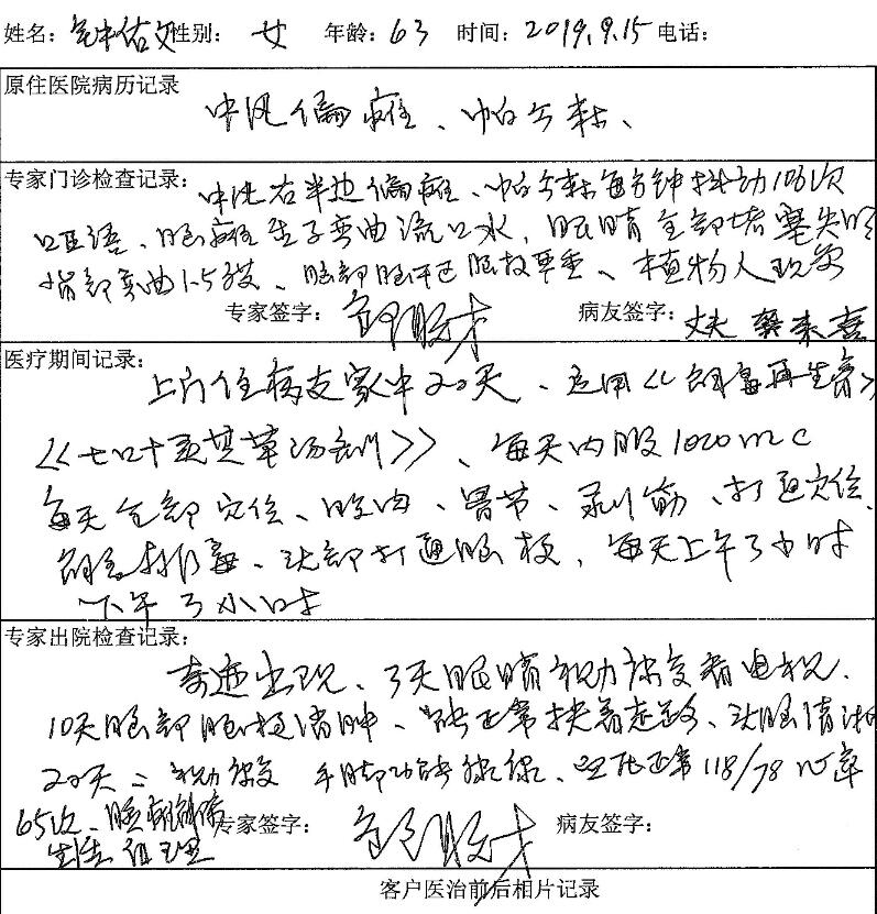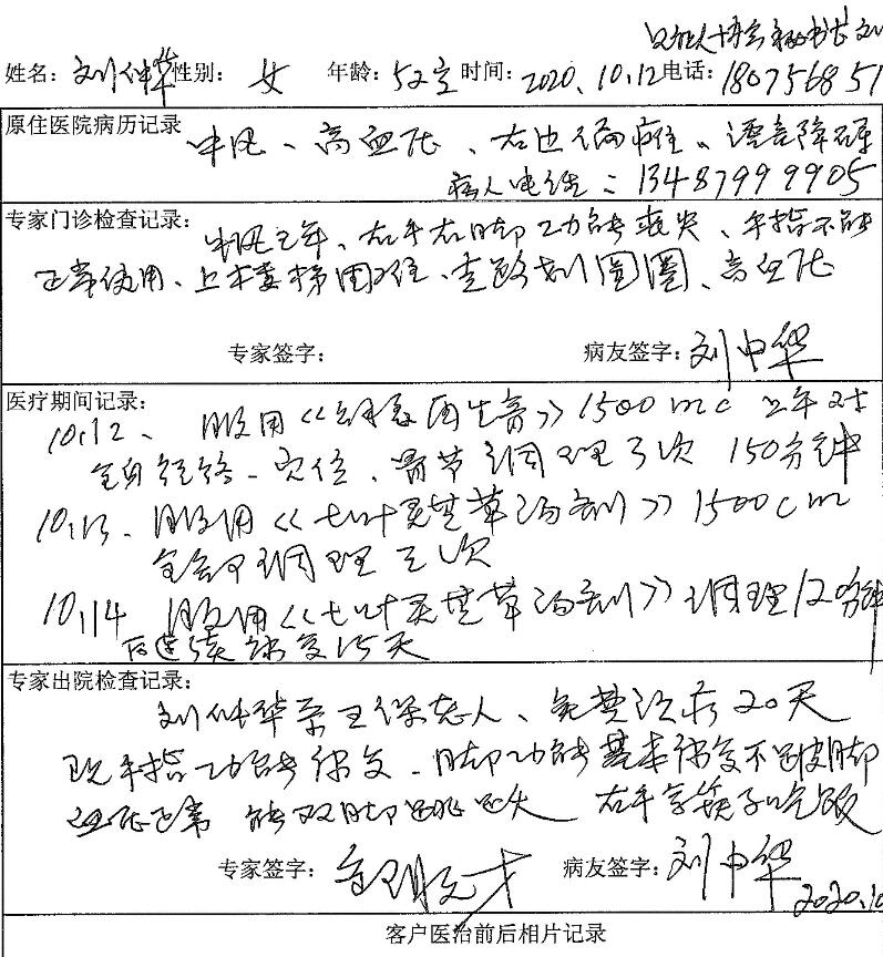 9、患者陈石林,性别男,年龄55岁,患有高血压中风右瘫,经过我用祖传秘方七天的治疗,手可以伸到180度,手指活动能伸能缩,脑梗肿块消失,哑语发声正常,双脚功能恢复。