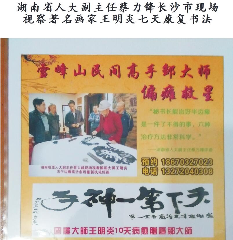 3、2018年3月在湖南长沙市替著名水墨画66岁画家王明炎医治六年右边偏瘫后遗症,7天右手重新执笔画画。王明炎是继齐白石先生后第八位大画家,赠送二幅“张家界”“桂林山水”的巨画酬谢。