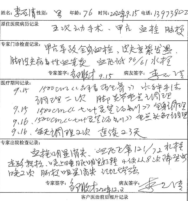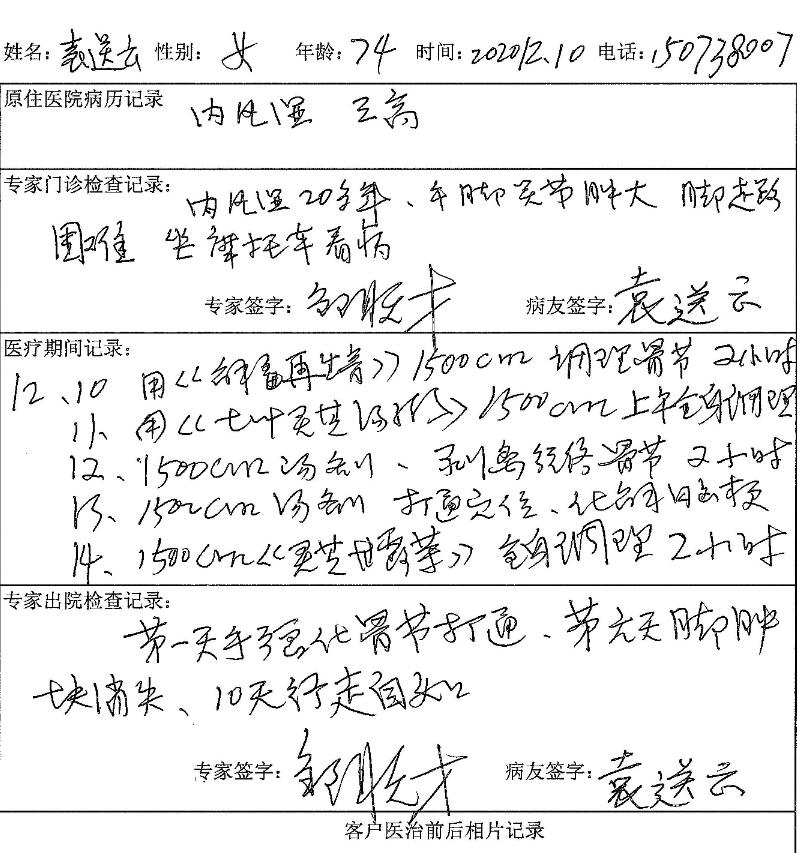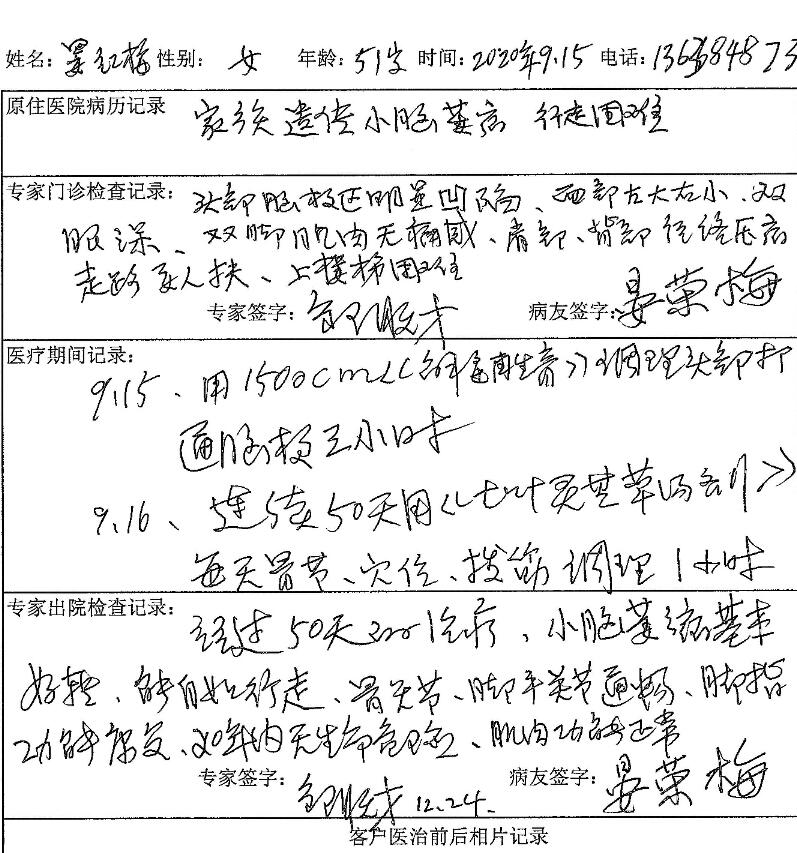 10、患者何应娥,性别女,年龄62岁,不小心在家门口跌倒导致下身瘫痪,经过我的祖传秘方治疗以后,可以从轮椅上下来行走。