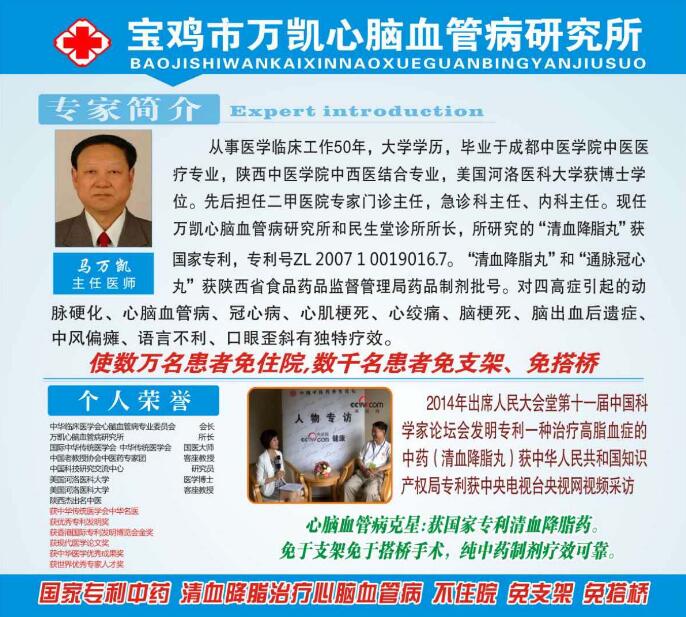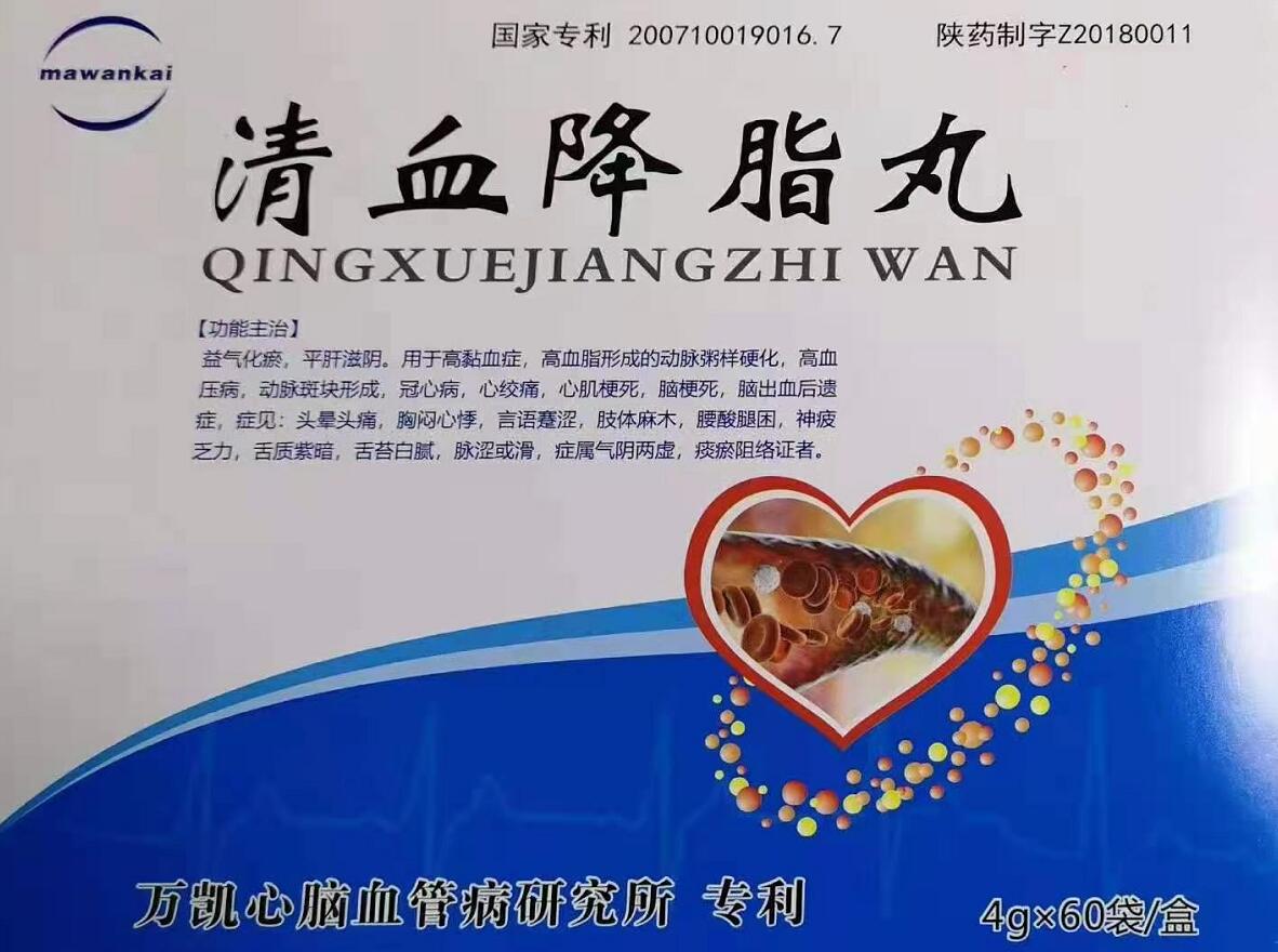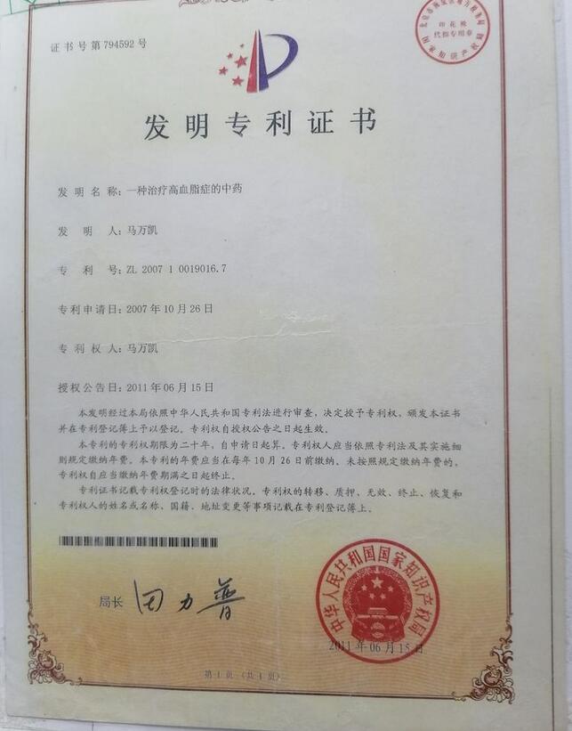 1、宝鸡市万凯心脑血管病研究所所长马万凯,根据古今名医案例500例及本草纲目中药药性,结合现代医学对中药化学成分研究,临床治疗五万多例高脂血症形成心脑血管病患者,多次验证,从上百种中药材中精选,经历20多年应用,研究出心脑血管病克星清血降脂丸和通脉冠心丸,属纯中药制剂。经中华人民共和国知识产权局四年审核,于2011年6月15日授予发明专利证书(专利号;ZL200710019016.7),获陕西省食品药品监督管理局药品制剂批号,省药监局批号清血降脂丸陕药制字Z20180011和通脉冠心丸陕药制字Z20180012。