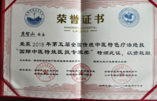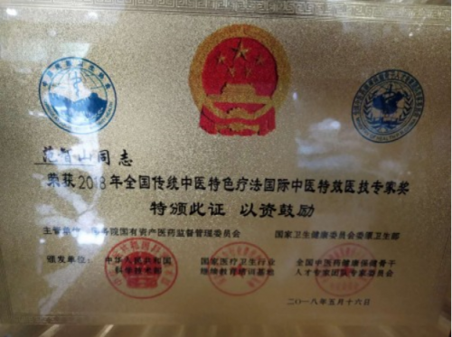 特聘世界医药卫生理事会荣誉医学专家、全国传统中医特色疗法国际中医特效医技专家奖、全国百家知名特色医师、《中国特色医疗大典》(珍藏版)获得“中国特色名医金牌”、全国第四届公益中医绝技交流大会上荣获贡献奖、国际中医特效医技专家、中国特色医疗医药学会“杏林之子”、荣获2018年全国传统中医特色疗法高手二等奖、荣获中国骨病专科名医、荣获2017年全国传统中医特色疗法绝技贡献奖、荣获国际中医特效医技专家奖、荣获2017年全国传统中医特色疗法培训交流会传统名中医“特效医技专家奖”、荣获2018年全国传统中国特色疗法国际中医特效医技专家奖、传统名中医特效医技专家奖、中医学术交流会推拿比武第一名。