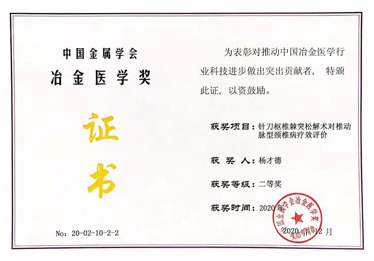 2020年12月,《针刀枢椎棘突松解术对椎动脉型颈椎病疗效评价》获得中国金属学会冶金医学奖二等奖(NO:20-20-10-2-2)。