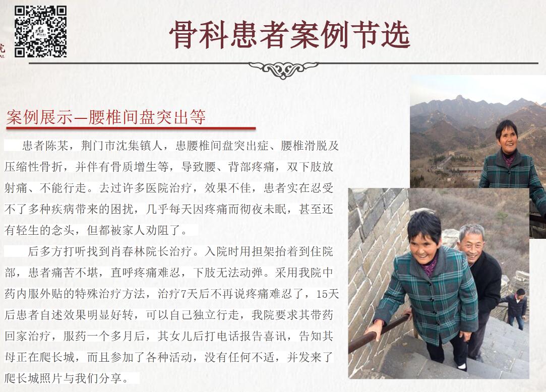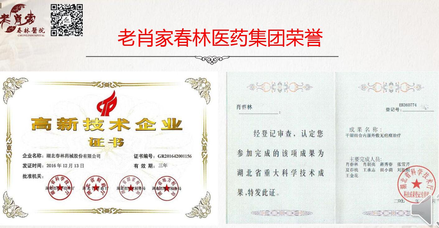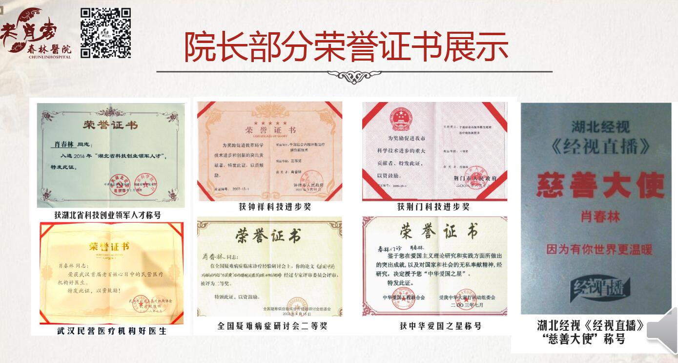 2015年获得湖北省科技拨尖人才。春林医院以疗效、医德赢得了社会的承认,获得钟祥市政府支持,特批准土地50亩,用于医院的扩建改造,同时也欢迎有志之士来钟祥市春林医院考察及投资合作!相信春林医院的明天会更加美好!