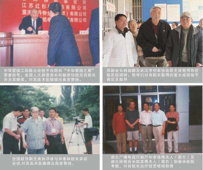 院长肖春林祖传六代行医,受到原国家卫生部长钱信忠,中华医学会会长杨镜等亲切接见;主持的《不植皮及无疤痕治疗烧烫伤新技术》于2003年1月10日通过了中国中医研究院科技合作中心专家评审,被列为2004年湖北省科技攻关计划,