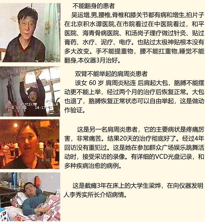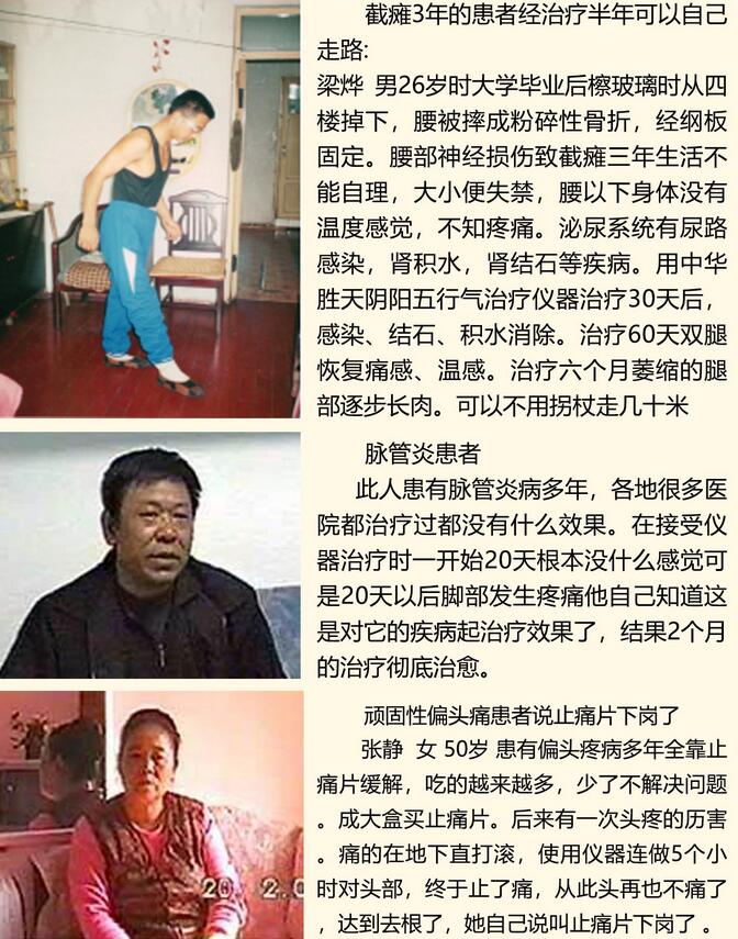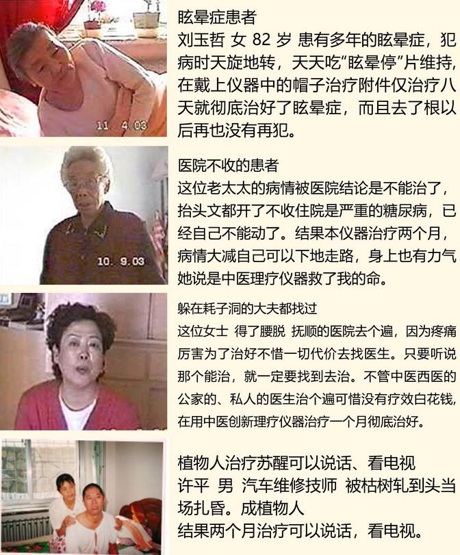 还有同类疾病康复病例,比如截瘫,植物人的康复都有病例,现在问题来了,常规用药治疗神经损害疾病很难奏效,为什么用中医理疗仪治疗就发生了巨大差异呢?我们非常需要研究用药治疗和用中医理疗仪器为什么会有不同的结果?